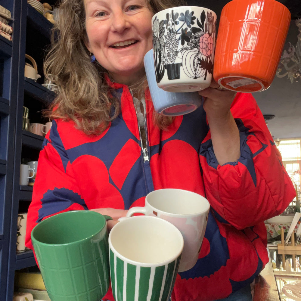 Ich kaufe nur Dinge, die mir gefallen und die ich gerne zu Hause hätte. Mein Mann und meine Kinder finden, wir hätten genug Tischdecken, Teller, Becher, Tassen, Butterdosen und Krüge. Mehr darf ich nicht ins Haus schmuggeln. Deshalb ist Kleuroptafel die perfekte Möglichkeit, mich mit allem zu umgeben, was ich gerne hätte; ich arbeite einfach mittendrin, Tag für Tag!